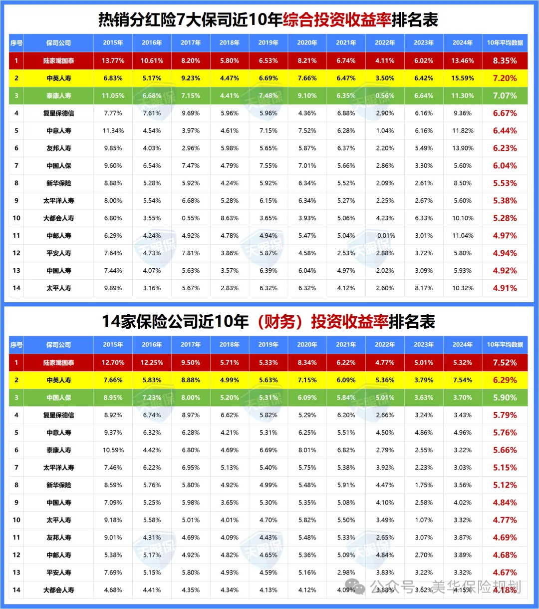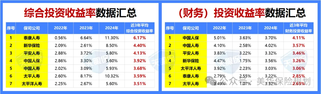 为了方便我们对大公司,和全网热销分红险对应的保险公司,投资盈利能力,有直观对比,所以,这里,我把14家保险公司的综合投资收益率和(财务)投资收益率,都整理了出来: