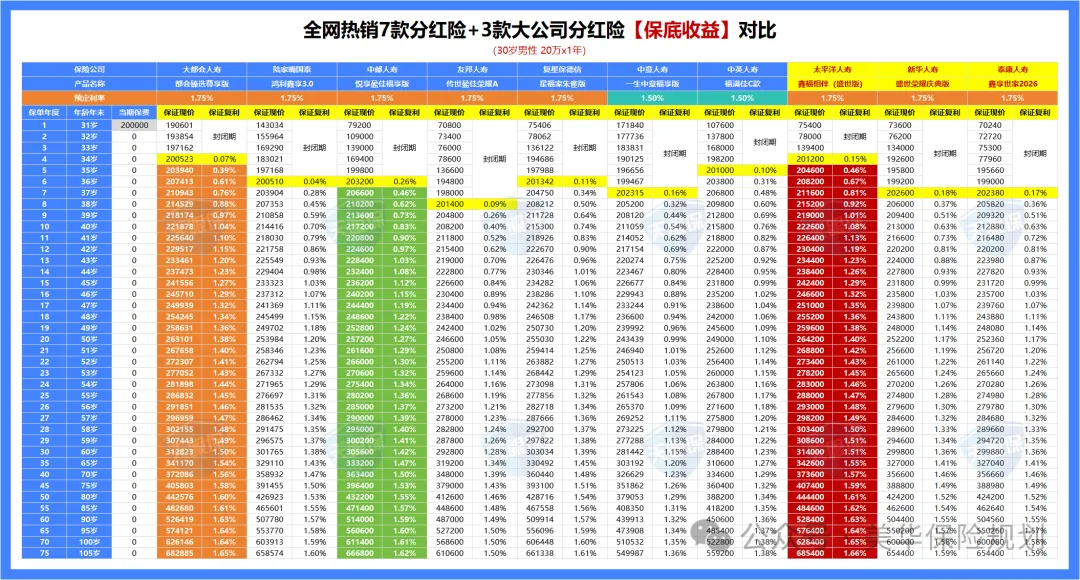 分红险,众所周知,真实收益是由保底收益+浮动收益共同组成的,所以,接下来,三文以30岁男性,一次性存20万为例,带大家看看,老7家大公司热销7款分红险,保底收益表现怎么样?