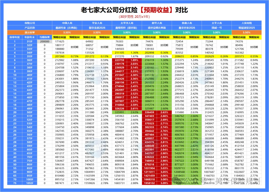 所以,接下来,我们来看一下,老7家大公司的分红险,预期收益表现如何?