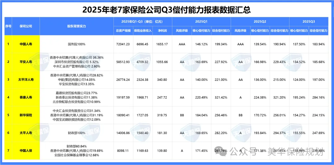 中国人寿,国务院100%控股,总资产规模、保费业务收入、净利润都是行业NO.1,风险评级也做到了AAA,真的不愧是保险行业老大哥,当然,其他6家公司,也都实力不凡。