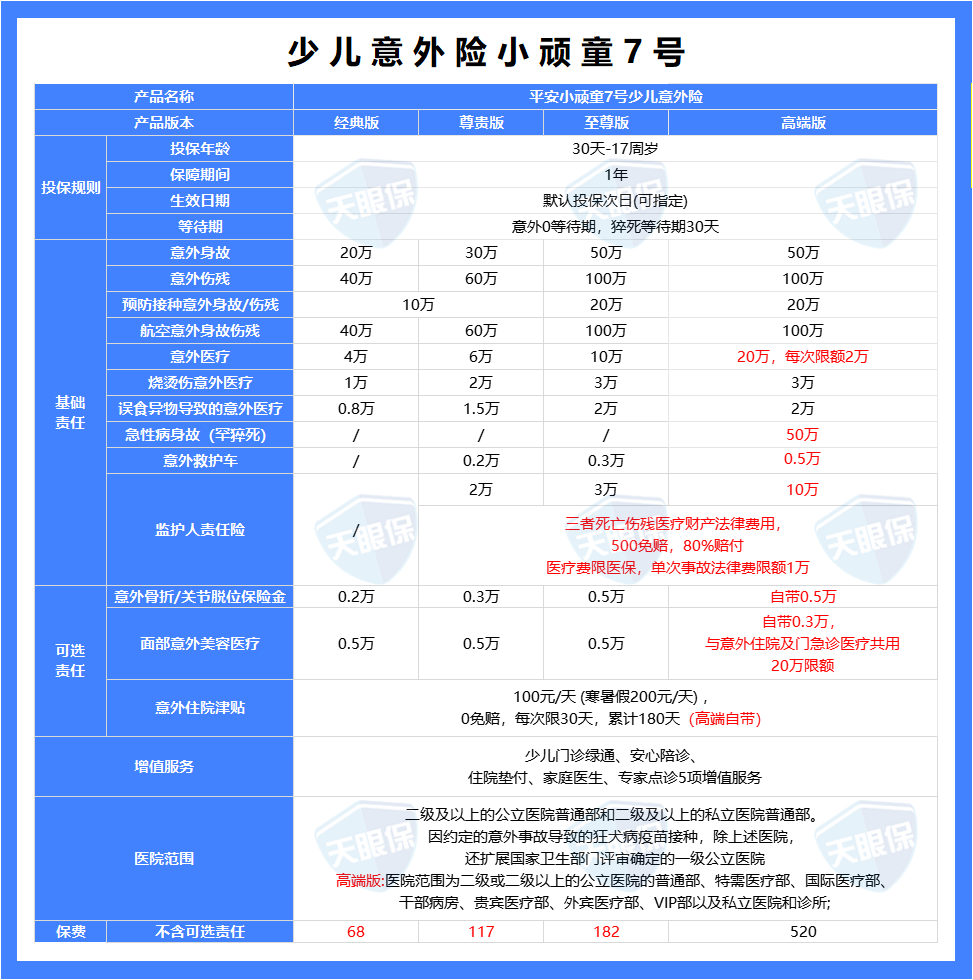 小顽童7号有四个版本可选:经典版、尊贵版、至尊版、高端版;在保额选择上依旧是10周岁以下20万保额,经典版即可,10周岁以上儿童三个版本可灵活选择。