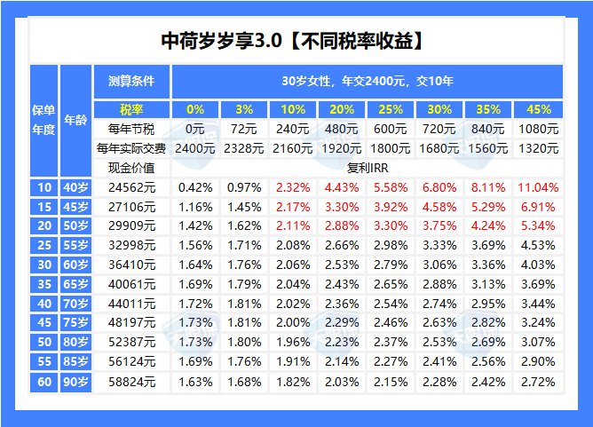 以30岁女性,交10年为例。如果你不退税,它本身的收益就已经很稳健了;