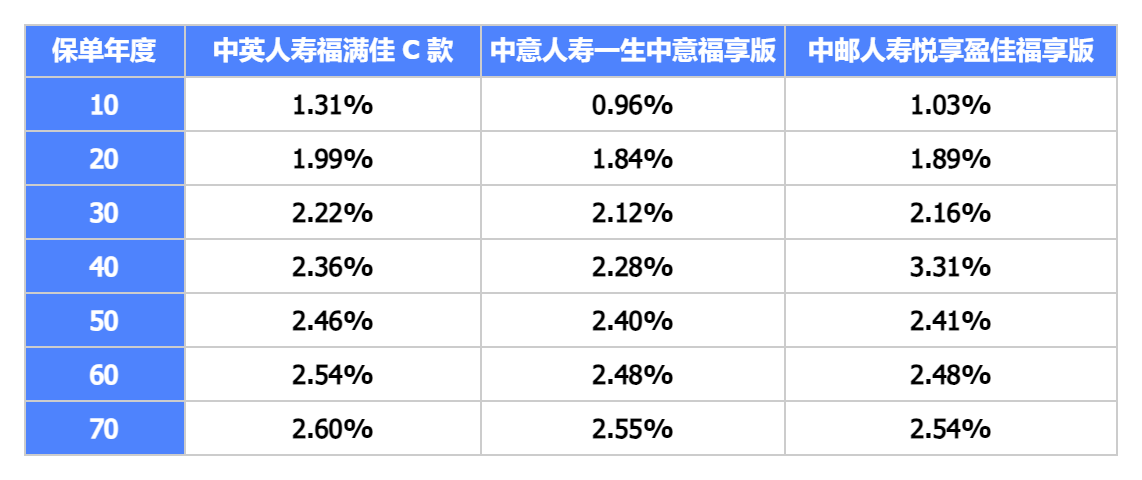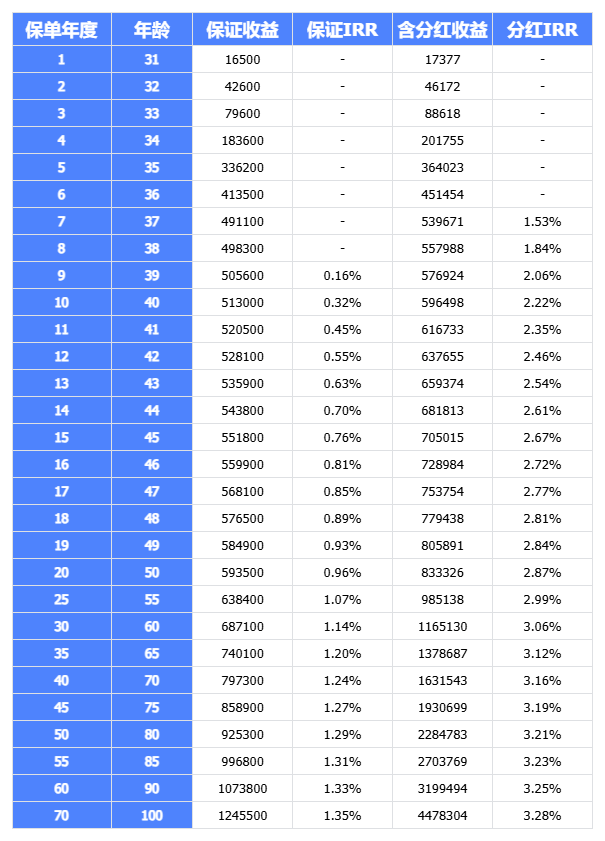 即便按最保守的50% 分红实现率测算,保单第 30 年复利 IRR 仍能达到 2.22%,长期持有复利最高可冲到 2.6%,不仅能跑赢同期银行定存,还能碾压绝大多数头部保司的同类型分红产品,无论市场行情如何,都能稳居行业第一梯队。