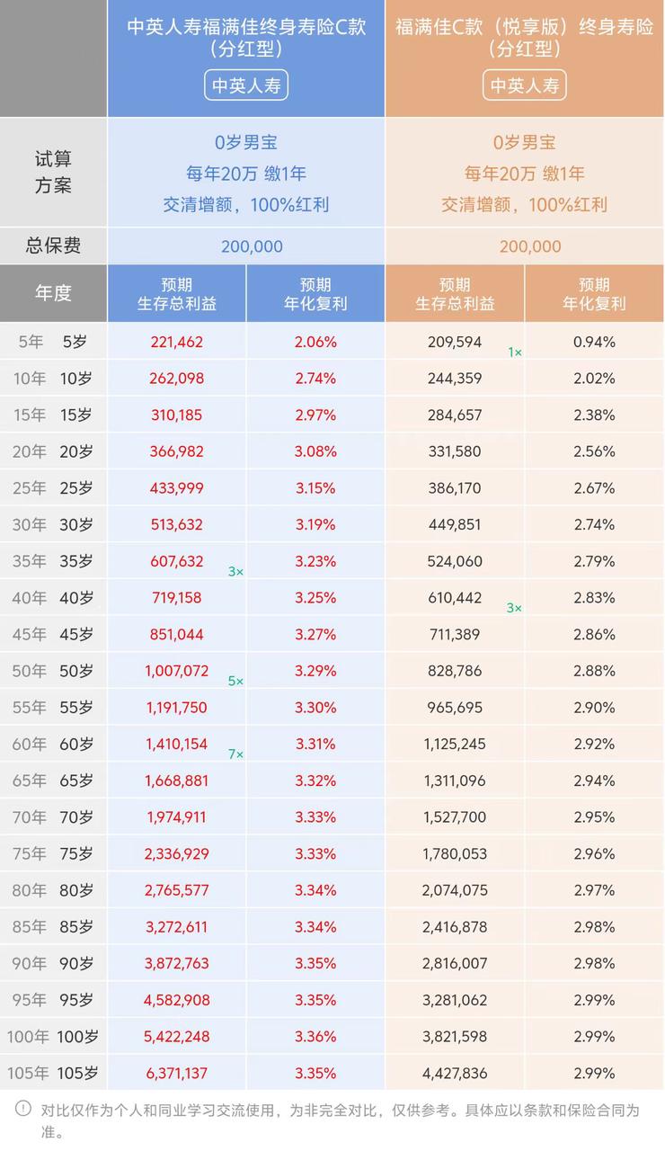 孩子 20 岁上大学:福满佳C366982 元,年化复利 3.08%,比新款多赚 35402 元,孩子 4 年的大学学费,差额就已经覆盖了大半;