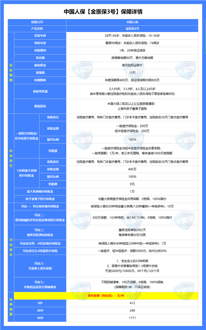 金医保3号是人保的产品,它的基础保障也很全,也保外购药,同样主险责任能保证续保20年。