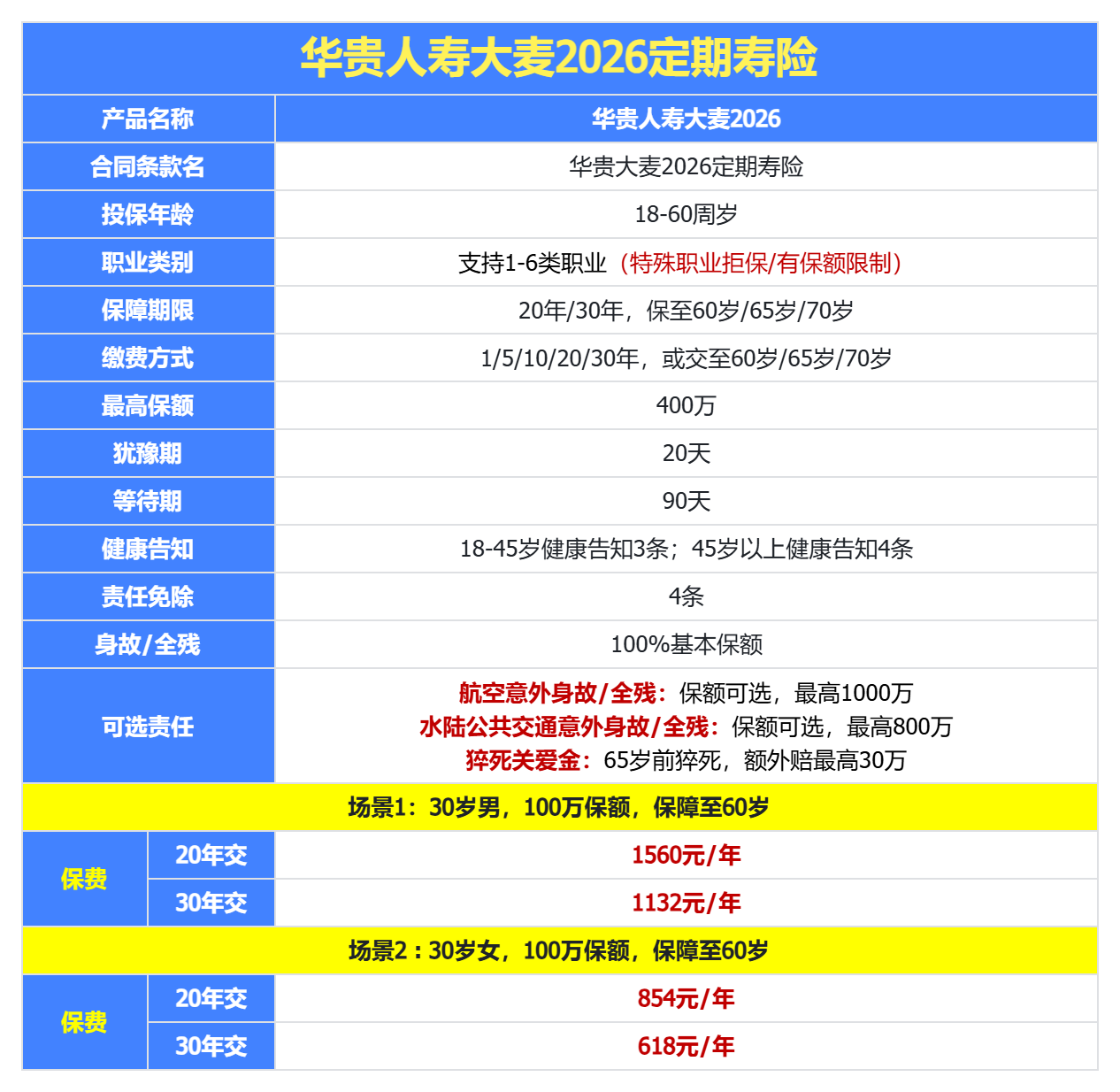① 价格不贵,100万保额,30年交,30岁男每年只要1132元,30岁女每年只要618元。