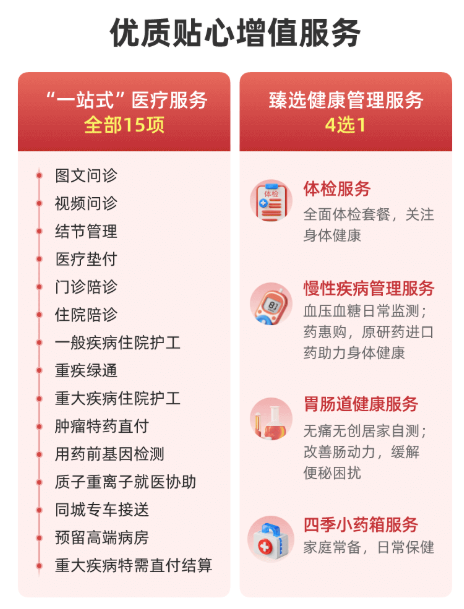 增值服务:16项实用服务(护工、垫付、重疾绿通、体检等)