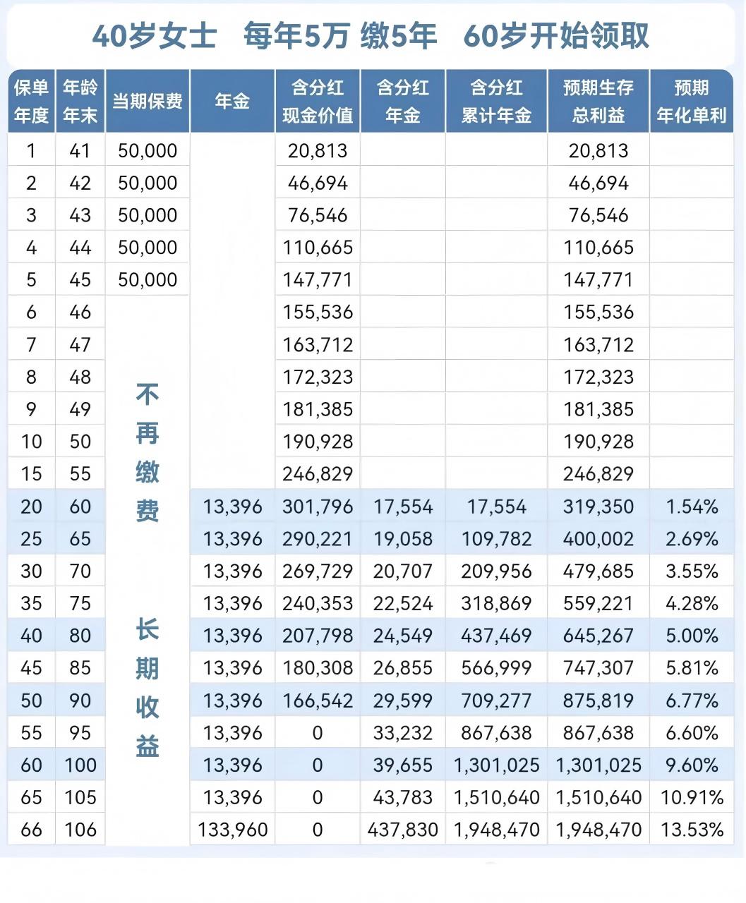 举个参考案例(具体以产品条款为准):40岁女性,每年交5万元,交5年,60岁开始领养老年金。