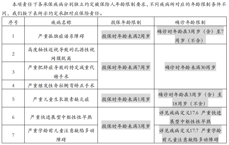 比如严重自闭症要求2周岁前投保,生长激素缺乏要求1周岁前投保。