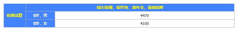 以0岁宝宝、买50万保额、交30年为例,男宝每年保费是4490元,女宝是4120元 :