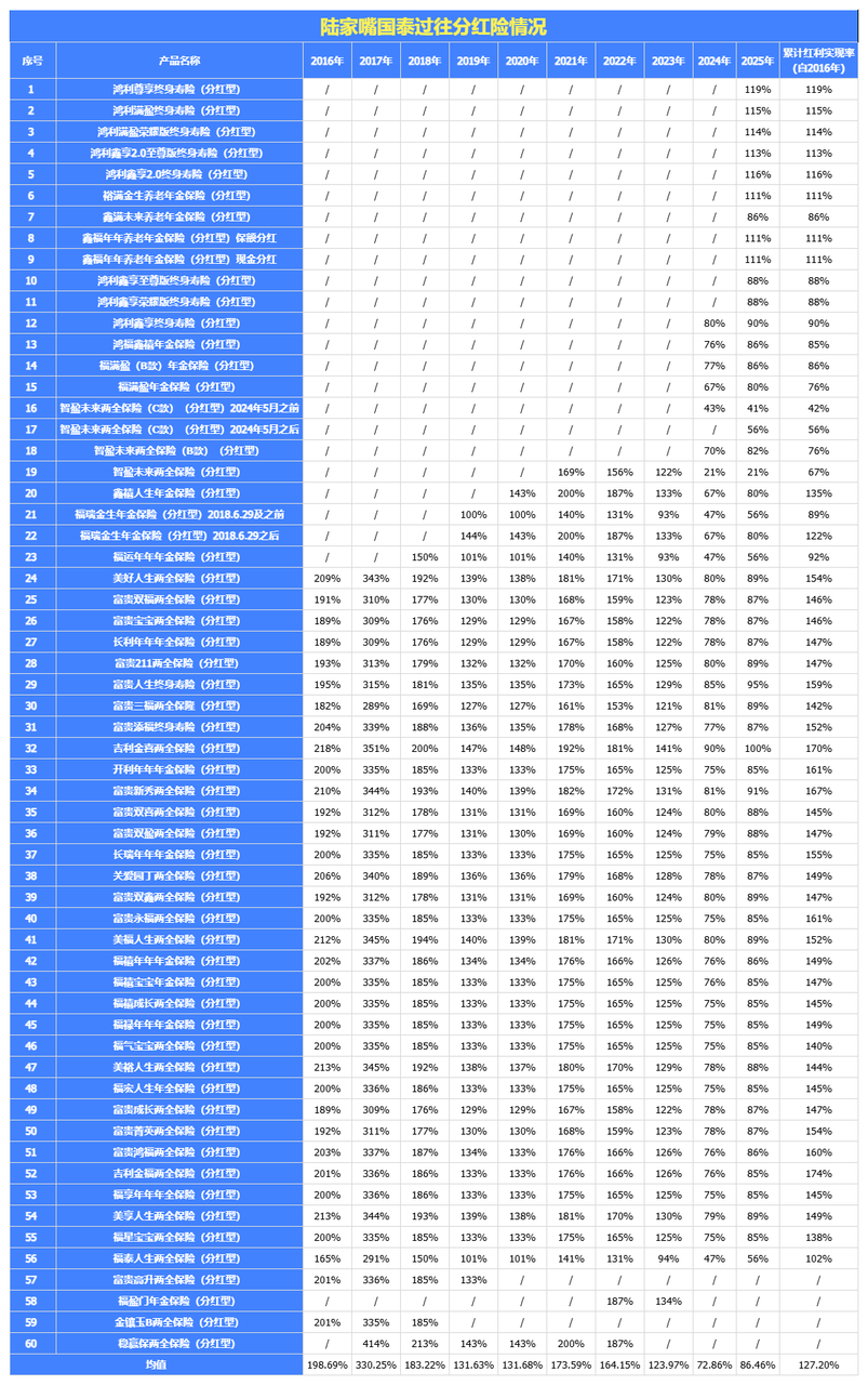 即使在全行业分红承压的2024年和2025年,其绝大多数产品的“年度红利”和“终了红利”依然死死焊在100%,部分产品甚至冲到了253%、301%。