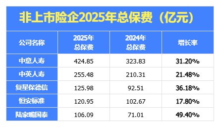中英人寿紧随其后,2025年总保费达255.48亿(同比增长21.48%),净利润达到8.46亿(同比增长19.66%)。