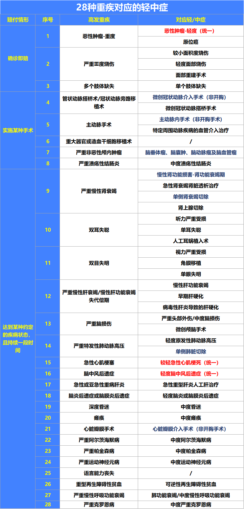 银保监会统一定义了这28种高发重疾,占据了所有重疾理赔的95%以上;