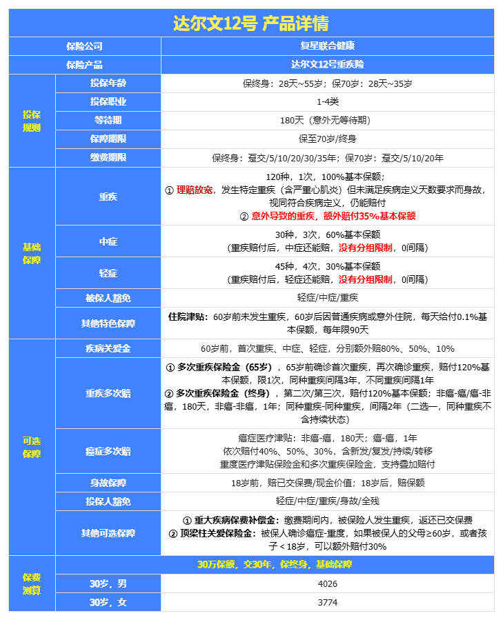 达尔文12号,和之前其他达尔文IP下的重疾险一样,都是同时期综合性价比TOP1级别的产品;