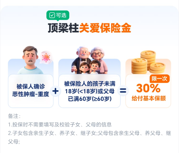确诊恶性肿瘤-重度时,若子女<18岁或父母≥60岁,额外赔付30%保额。