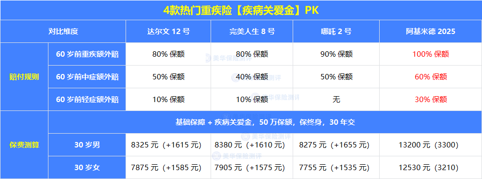 如果只对比赔付比例的话,那阿基米德2025是断层领先的,60岁前,重疾、中症、轻症分别能额外赔付100%、60%、30%;