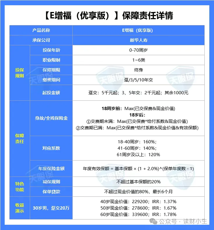 总之,如果你又想追求高收益,同时还想兼顾保司品牌,那新华人寿的这款E增福优享版就是第一选;如果有入住养老社区需求的朋友,也可以优先考虑这一款