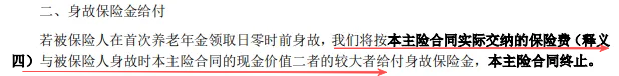 也就是你领钱的时候,账户里一直是有退保价值的。身故后,除了你之前已经领走的养老金,当年对应的现金价值也会全部赔付给你的家人