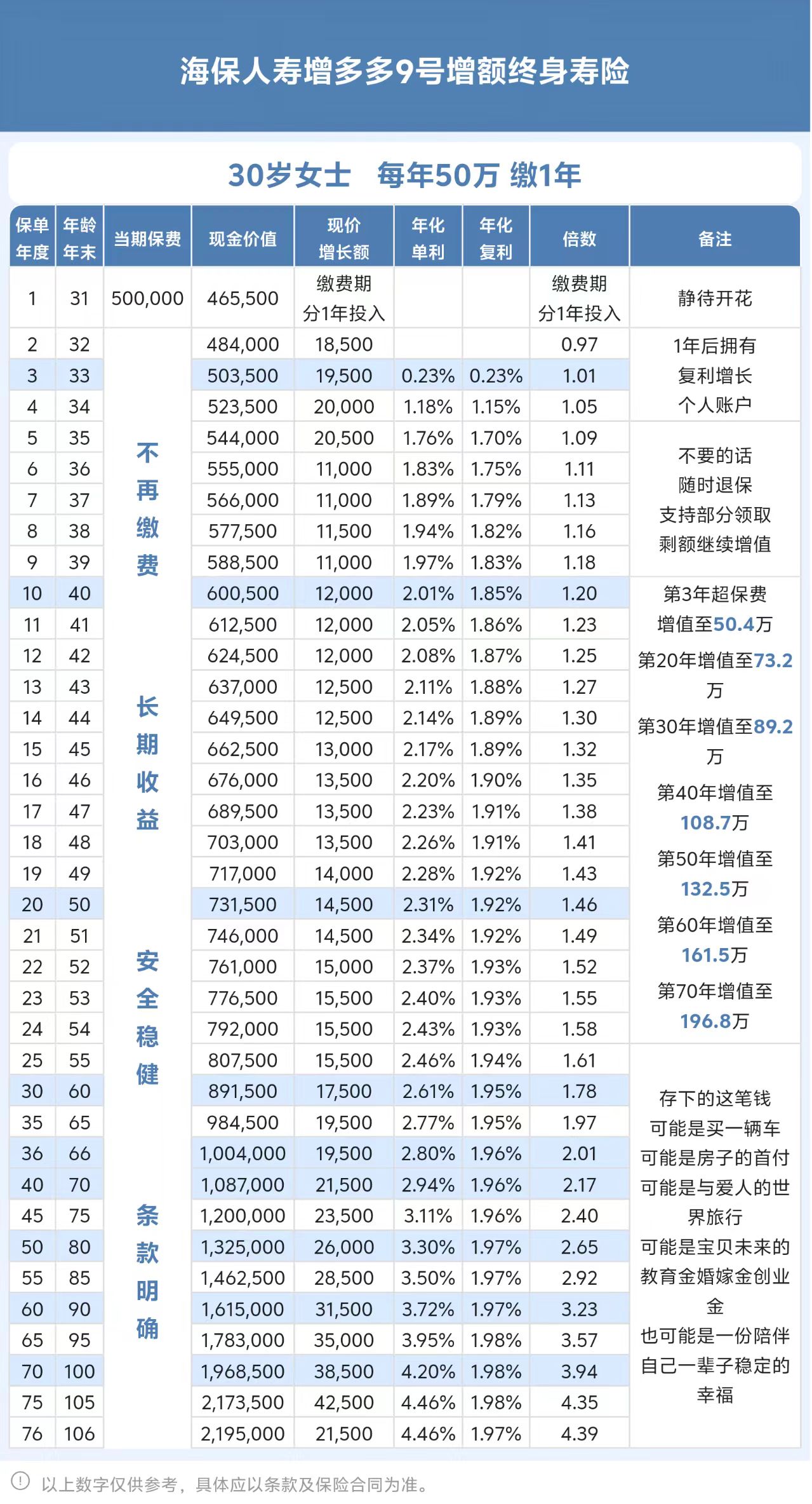 以目前第一梯队的「增多多9号」为例。我们拿 30 岁女性、50万一次性趸交来做利益演练: