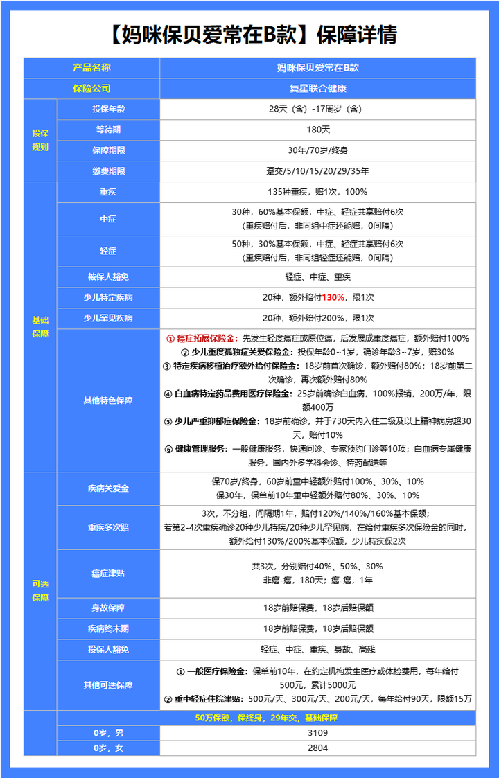 总的来说,妈咪宝贝爱常在B款,不管在保障上还是价格上,都是一骑绝尘,还没给娃买重疾险的家长们,可以优先选择这一款。