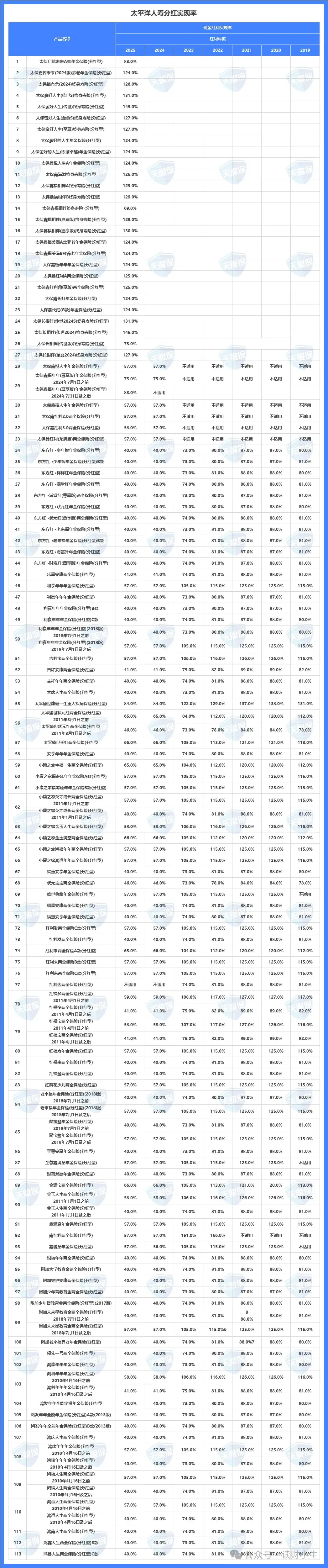 如上图是太平洋保额分红产品的分红实现率汇总,共累计20款;