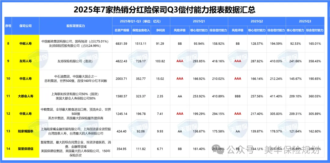 陆家嘴国泰为AA紧随其后,不过,需要注意的是,2025年第2几度,大都会风险评级由AA降低为了BBB;复星保德信和中邮人寿始终为BB,表现相对次之。