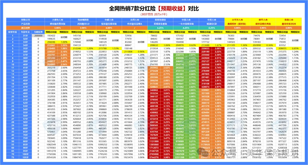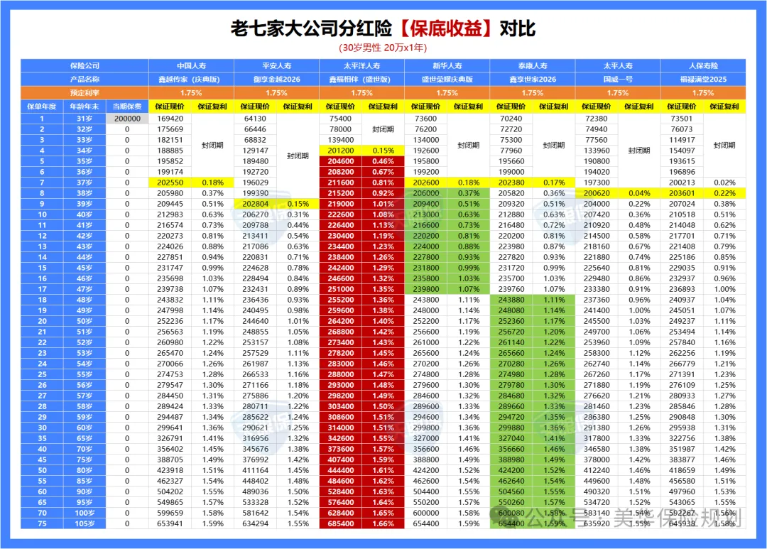 分红险,众所周知,真实收益是由保底收益+浮动收益共同组成的,所以,接下来,三文以30岁男性,一次性存20万为例,带大家看看,老7家大公司热销7款分红险,保底收益表现怎么样?