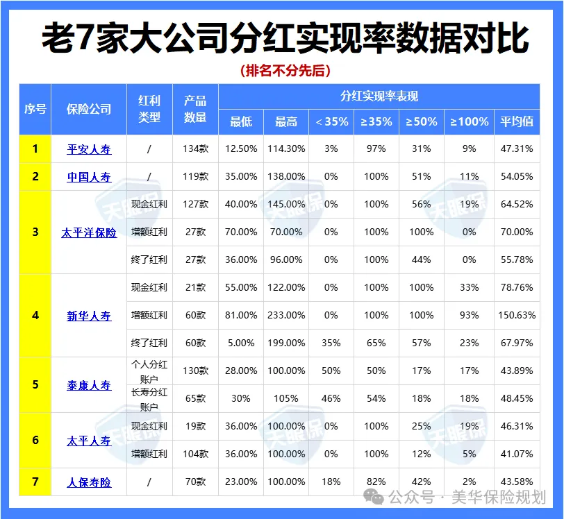 上面是2025年,最新披露的,老7家保险公司2024年度分红险的红利实现率汇总数据。