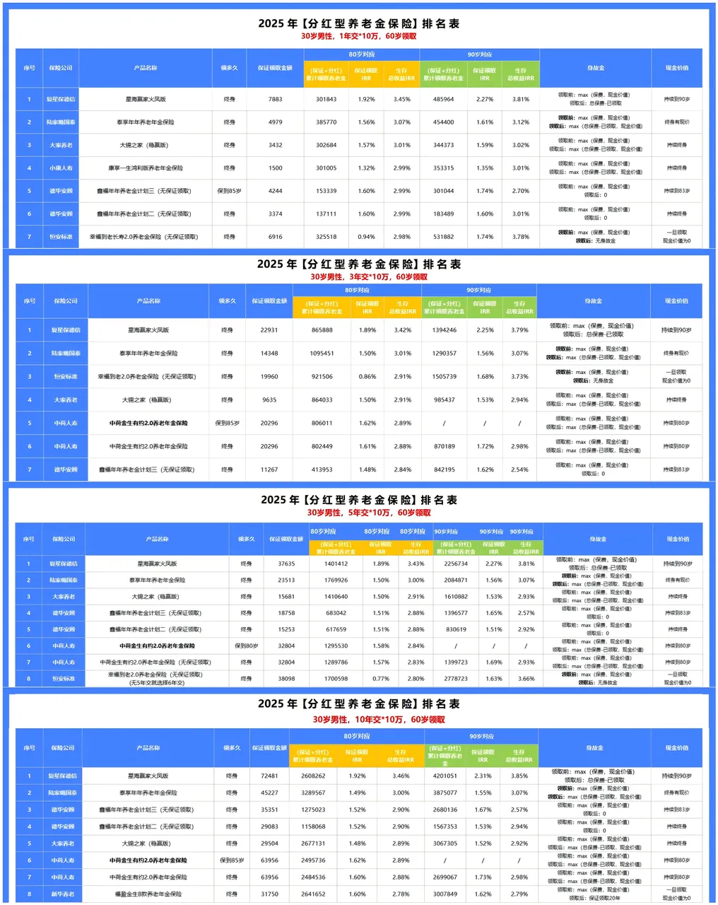 ①目前收益最高,星福家朱雀版的利率结构是1.75%/4.25%,采用高保底高演示的方式,当然其收益也是非常亮眼的,30岁女性交5年,每年交10万,到60岁时IRR就已经突破3%,而更长期持有红利演示收益更高,且各个交期的的收益表现也基本都稳定在榜首。