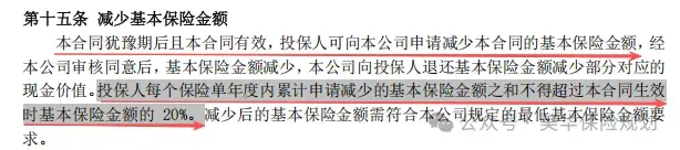 每年可减保:生效时基本保额20%>申请时基本保额20%>实际已交保费20%>累计已交保费20%