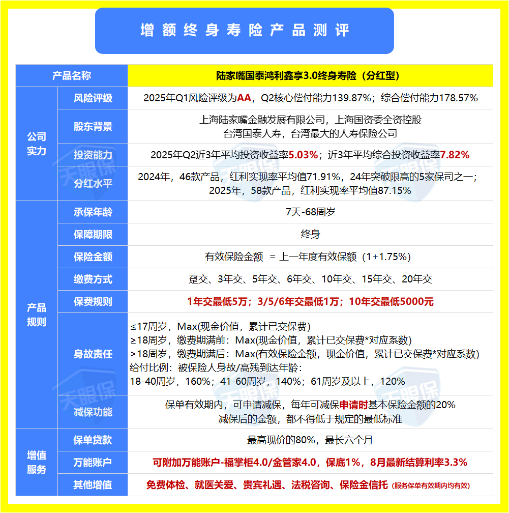 整体来说,陆家嘴国泰鸿利鑫享3.0,各方面表现都非常的优秀,既有分红的能力,也有分红的意愿,产品也是绝佳,尤其还支持万能账户,对于有万能账户诉求的朋友来说,或者对于不想要外资背景保司的朋友来说,鸿利鑫享3.0,就是首选产品了~
