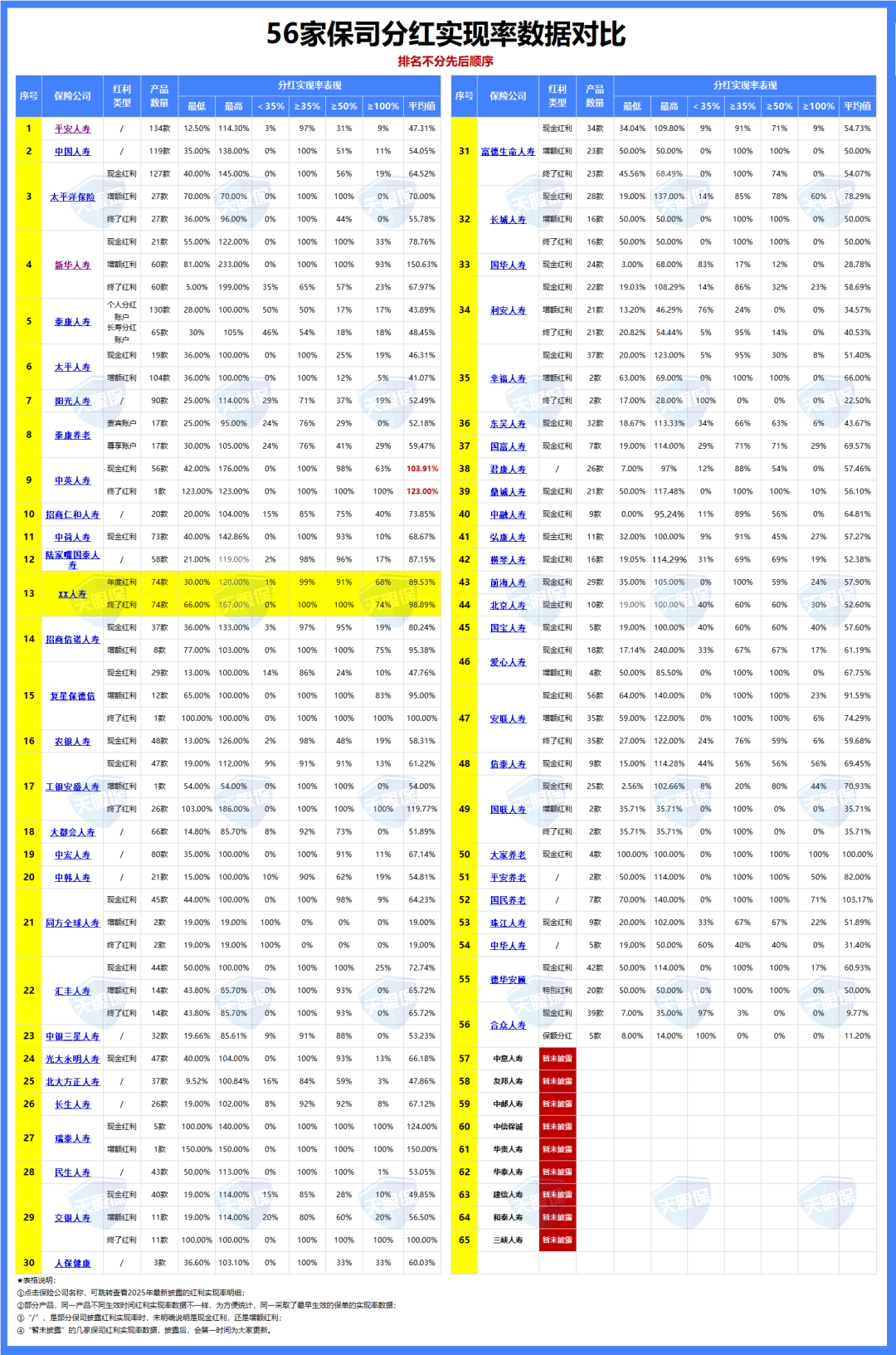 如今监管对分红险“限高令”放宽,而且这个几个月又刚好是各家保司公布今年分红实现率的,我这边做了56家最新分红实现率汇总对比,我们一起来看: