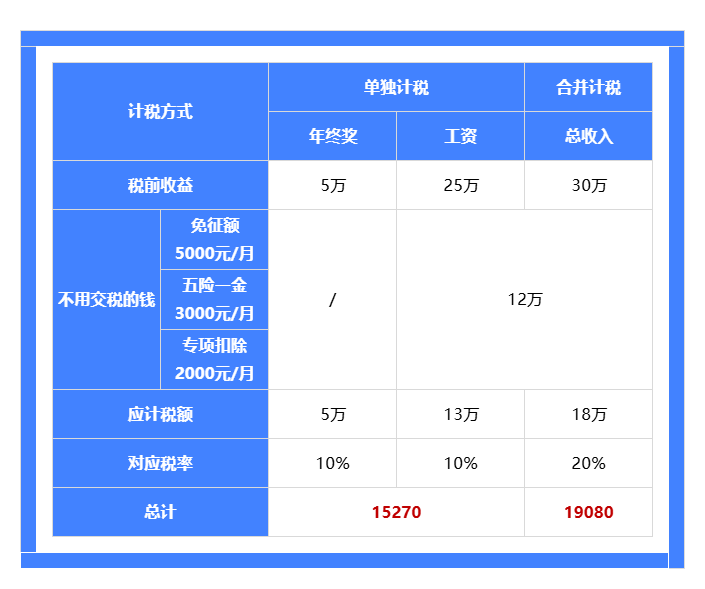 2)合并计税:年终奖和工资合并,按总收入一共来计税;