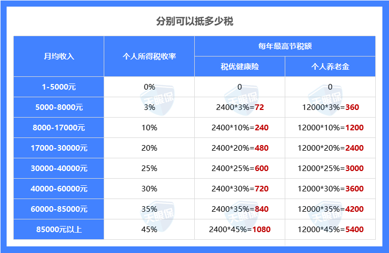 那下面我们再来看一下,个人养老金与税优健康险在最高额度下,分别可以抵多少税,如下图: