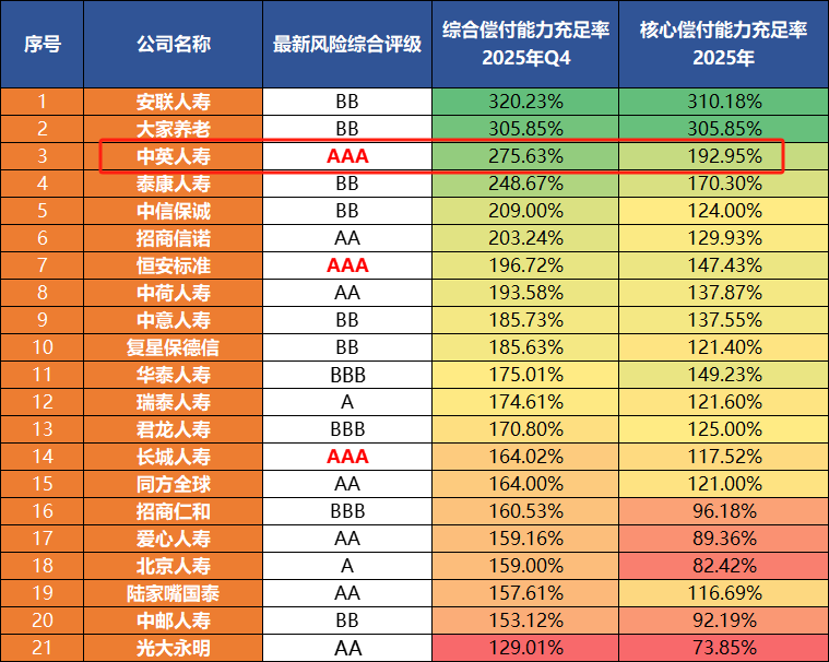 但中英人寿,综合偿付能力充足率达到了275.63%,核心偿付能力充足率达到了192.95%,风险评级达到了AAA,都远在标准之上。
