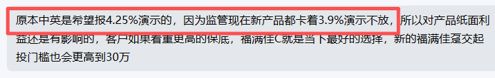 换句话说,以后市面上,再也不会有合规的4.25%演示利率分红险了。