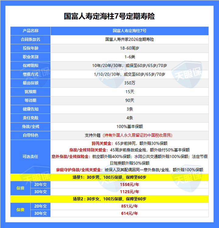 ① 价格不贵,100万保额,30年交,30岁男每年只要1132元,30岁女每年只要618元。