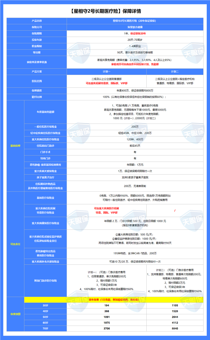 星相守2号是星相守的升级版,四项基础责任都齐全没有一点猫腻,外购药都全都可以报销,而且所有责任都保证续保20年,非常稳定。