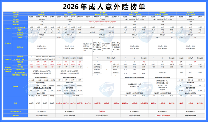 这里呢,我们测评对比了全网性价比天花板的成人意外险榜单: