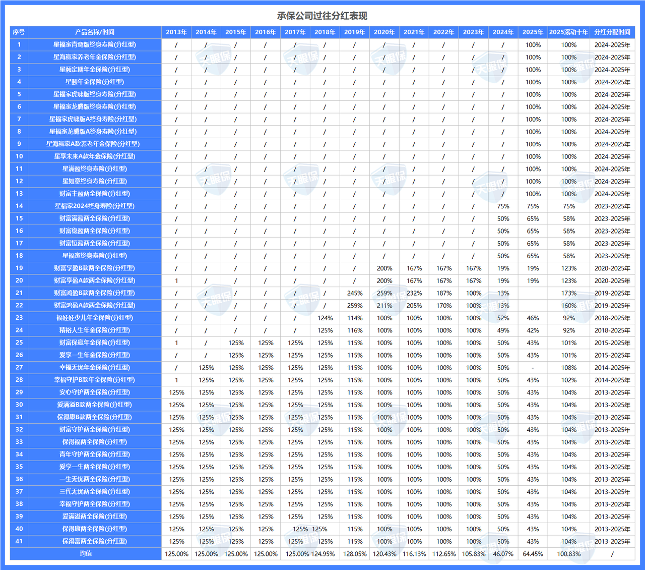 2024 年之前的所有分红型产品,分红实现率均在 100%-259% 之间,全部超额完成演示收益;