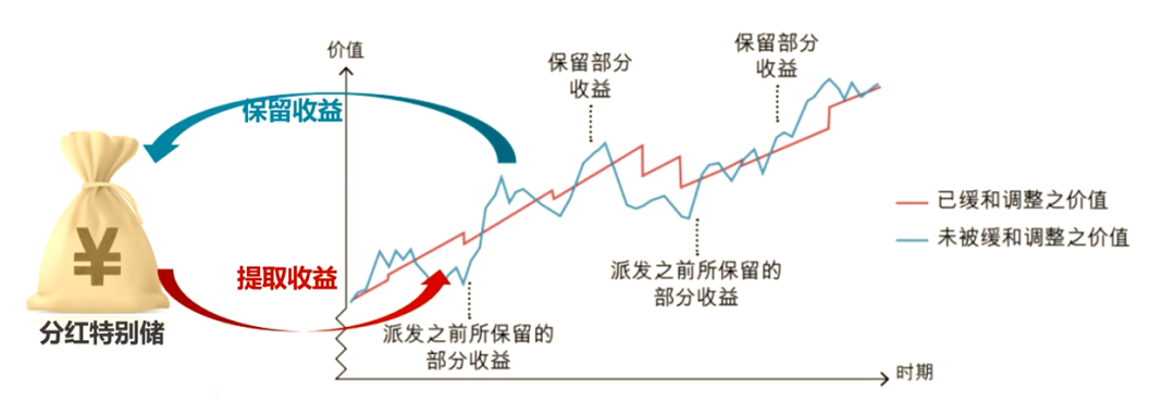 当市场波动、投资收益不理想时,保司就从“蓄水池”里放水,补充给客户,让大家每年都能拿到相对稳定的回报。