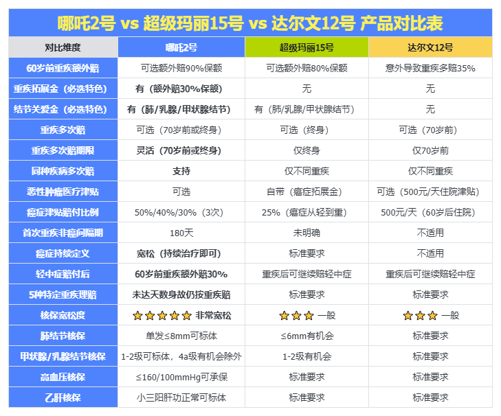 看中核保与性价比选哪吒2号;强化癌症/结节深度可选超级玛丽15号;重视多次赔付与意外叠加选达尔文12号。