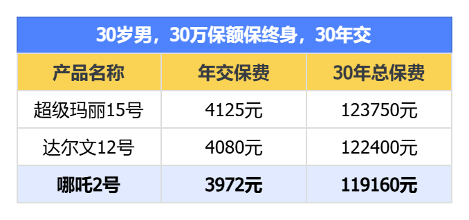 以30岁、30万保额、保终身、30年缴费为例,哪吒2号的年保费如下: