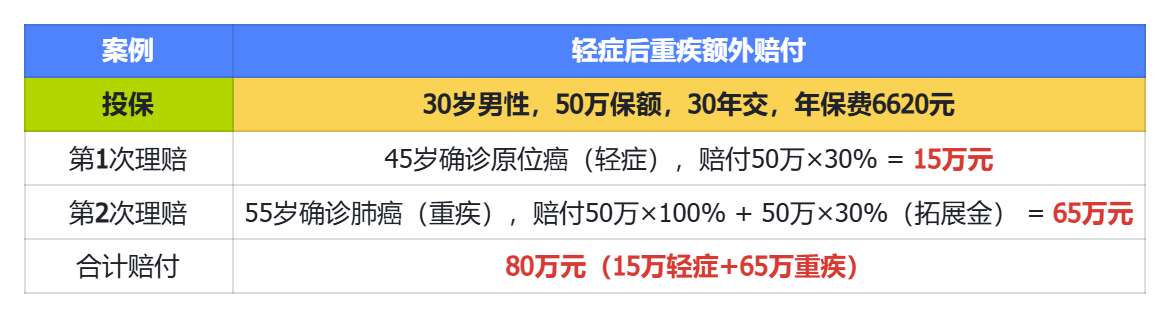 举个例子,买了50万,先得轻症赔了15万,60岁前再得重疾,可以赔到65万。