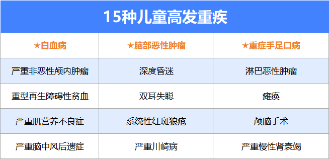 必须重点看有没有包含白血病、重症手足口病、严重川崎病等15种专属少儿高发疾病