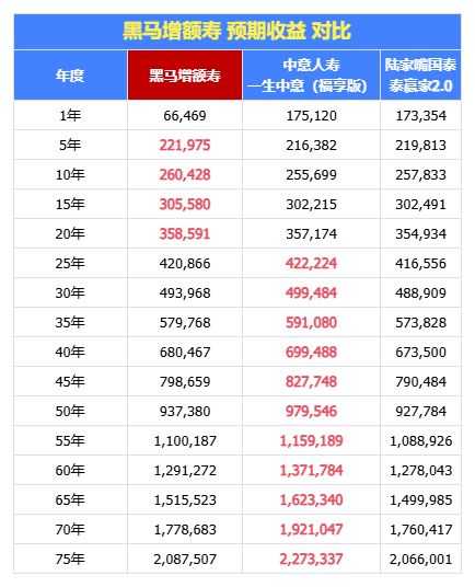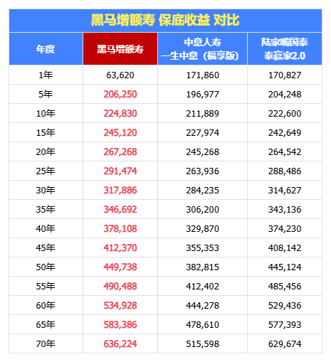 如上图可以看出,从第5年开始,黑马增额寿的保底现金价值就一路领先,就连我们熟悉的一生中意(福享版)、泰赢家2.0都略显逊色。