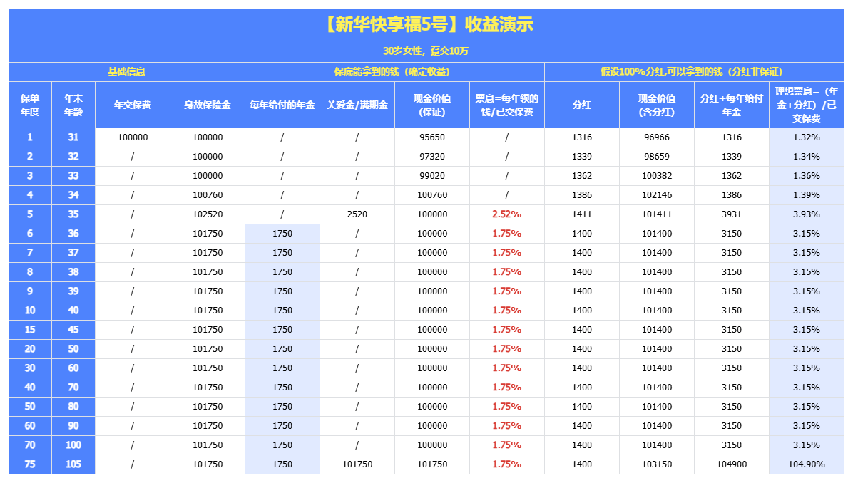 两笔钱加在一起,前5年综合收益在1.4%左右,第6年开始每年能拿到3.15%左右。