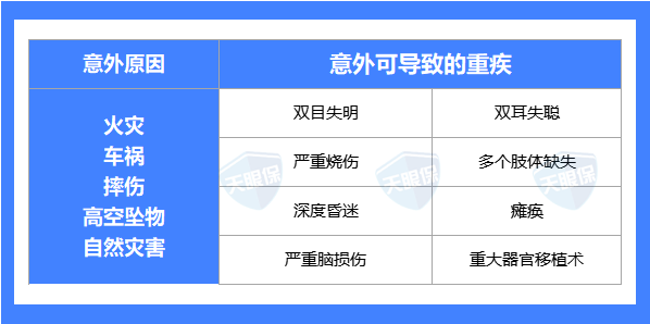 其中交通事故、高空坠落占比超过了60%,现实中很多重疾都是由意外事故直接引发,比如: