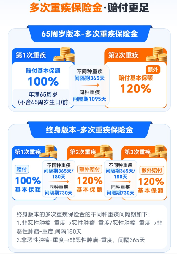 不管前后是同种重疾复发,还是不同种重疾新发,都有机会赔付,间隔期最短只要180 天,仅同种疾病持续状态不赔,门槛已经非常宽松。