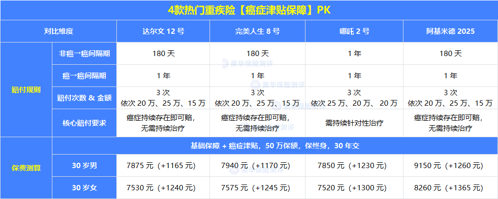 下面咱们直接对比四款产品的癌症津贴保障和附加成本,看看哪款最值得加: